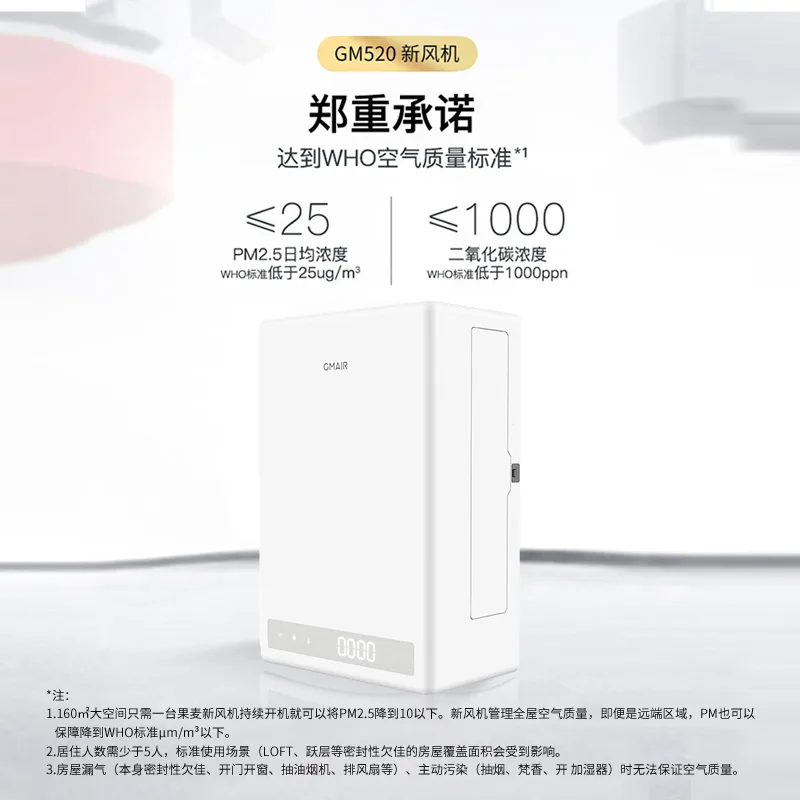首页/产品/GM520 Pro果麦壁挂式静音除甲醛新风机 GM520 Pro参数列表产品尺寸238 * 374 * 536 mm额定功率90 W热能功率500 W + 500 W产品重量20 kg适用面积160 ㎡运行风量60 - 420 m³/h运行噪声12.3 - 48.9 dB(A)智能硬件支持 小爱同学 和 天猫精灵 语音控制购买渠道天猫 GM520 Pro京东 GM520 Pro