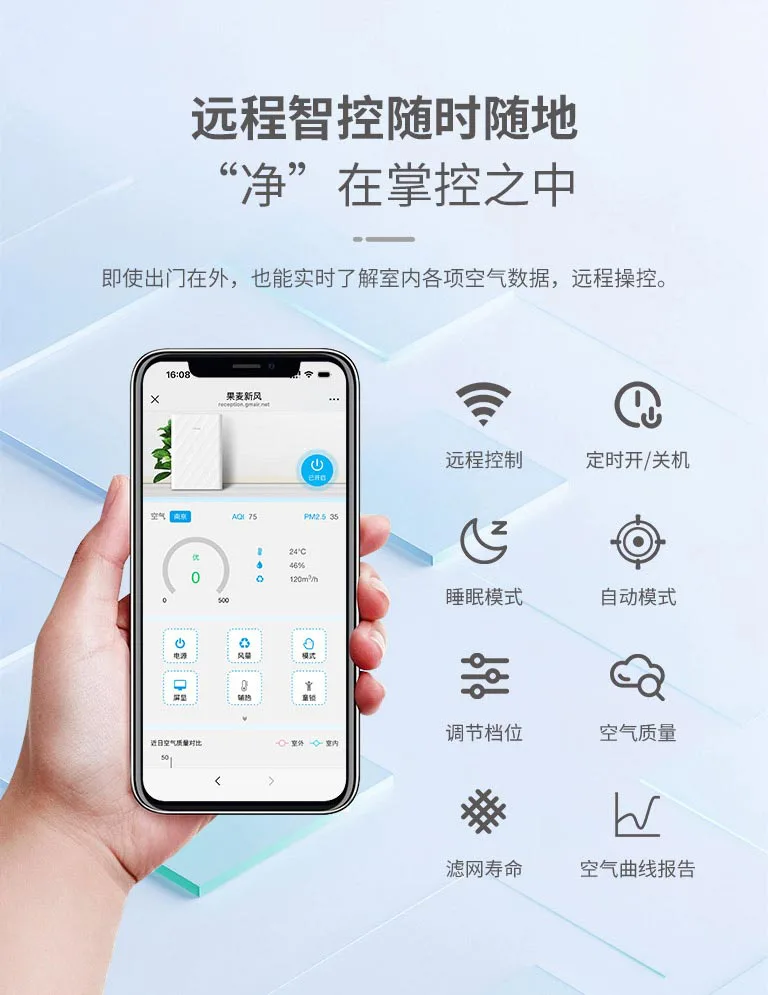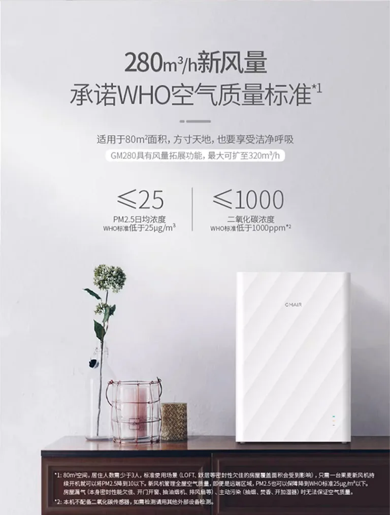 首页/产品/GM280 (Pro)果麦壁挂式新风机 GM280(PRO)参数列表产品尺寸210 * 325 * 480 mm适用面积80 ㎡运行风量30 - 280 m³/h运行噪声11.7 - 44.8 dB(A)额定功率38 WPTC 热能功率300 W + 300 W产品重量8.6 kg换气方式单向流机身材质改性阻燃 ABS智能硬件支持 小爱同学 和 天猫精灵 语音控制购买渠道天猫 GM280 (Pro)京东 GM280 (Pro)
